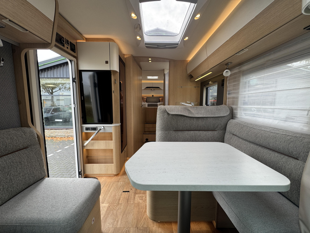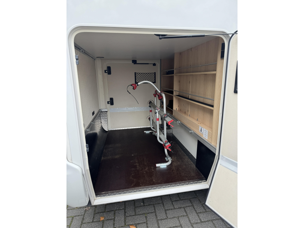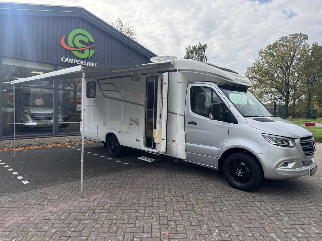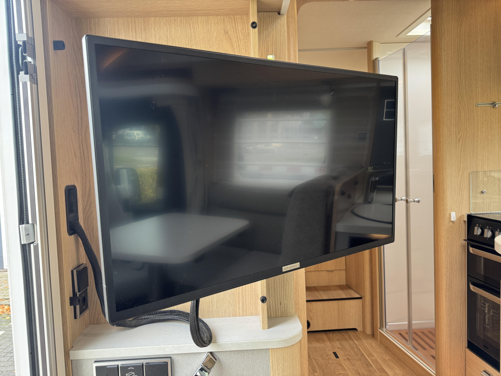 De Hymer is voorzien van luxe opties als twee zonnepanelen, een 32”inch televisie, Hymer Smart Battery System, fietsendrager in de garage.