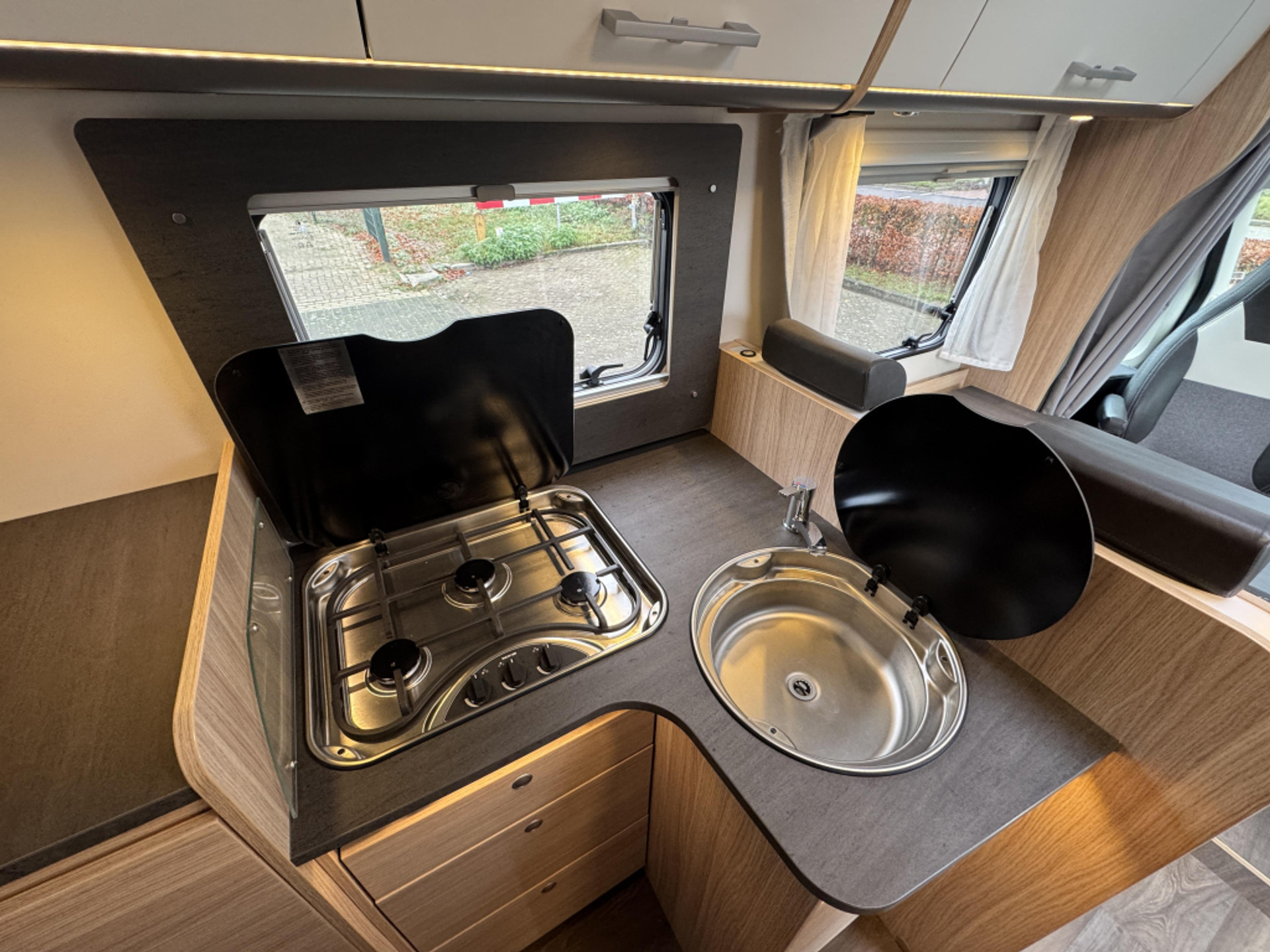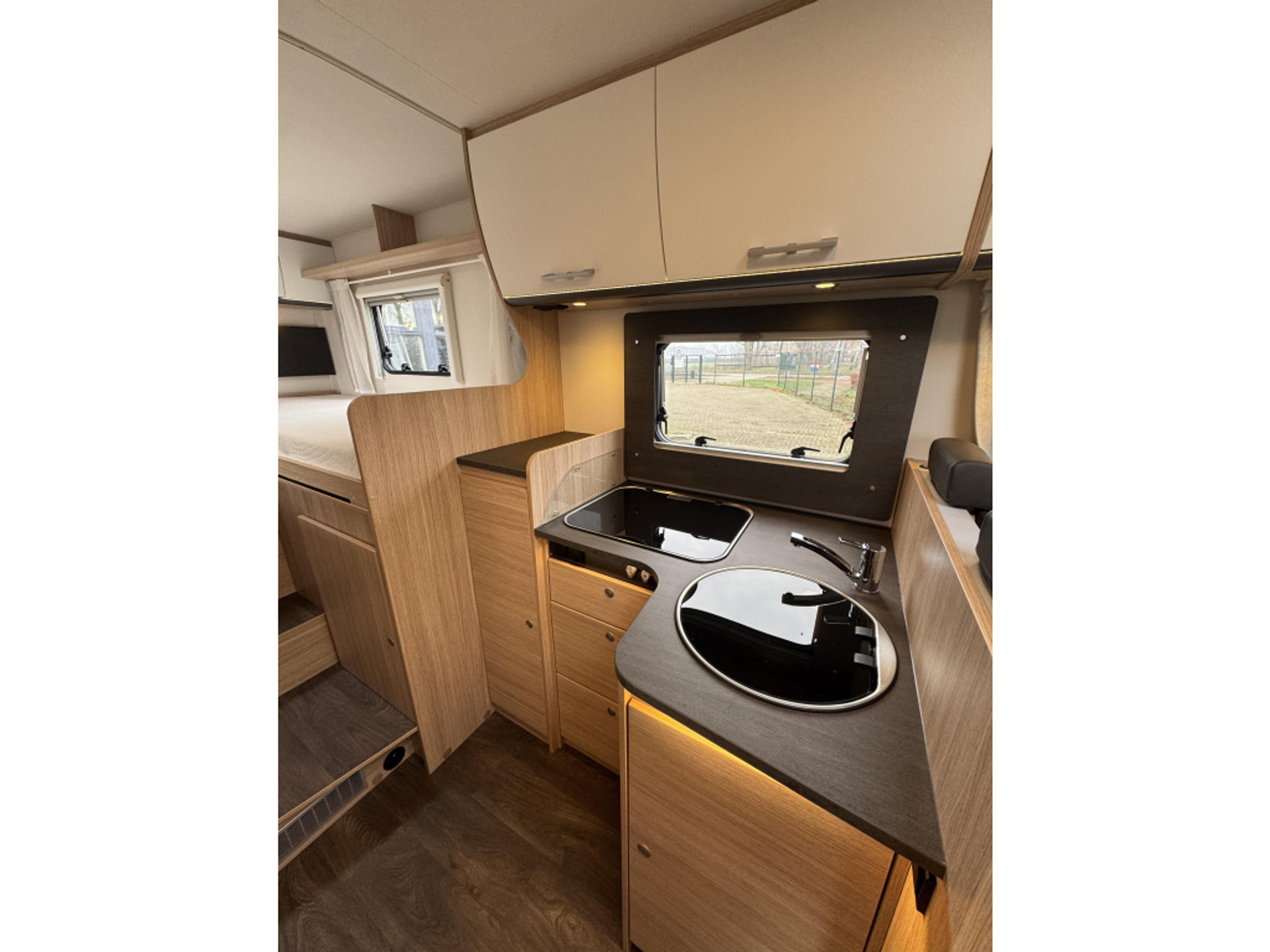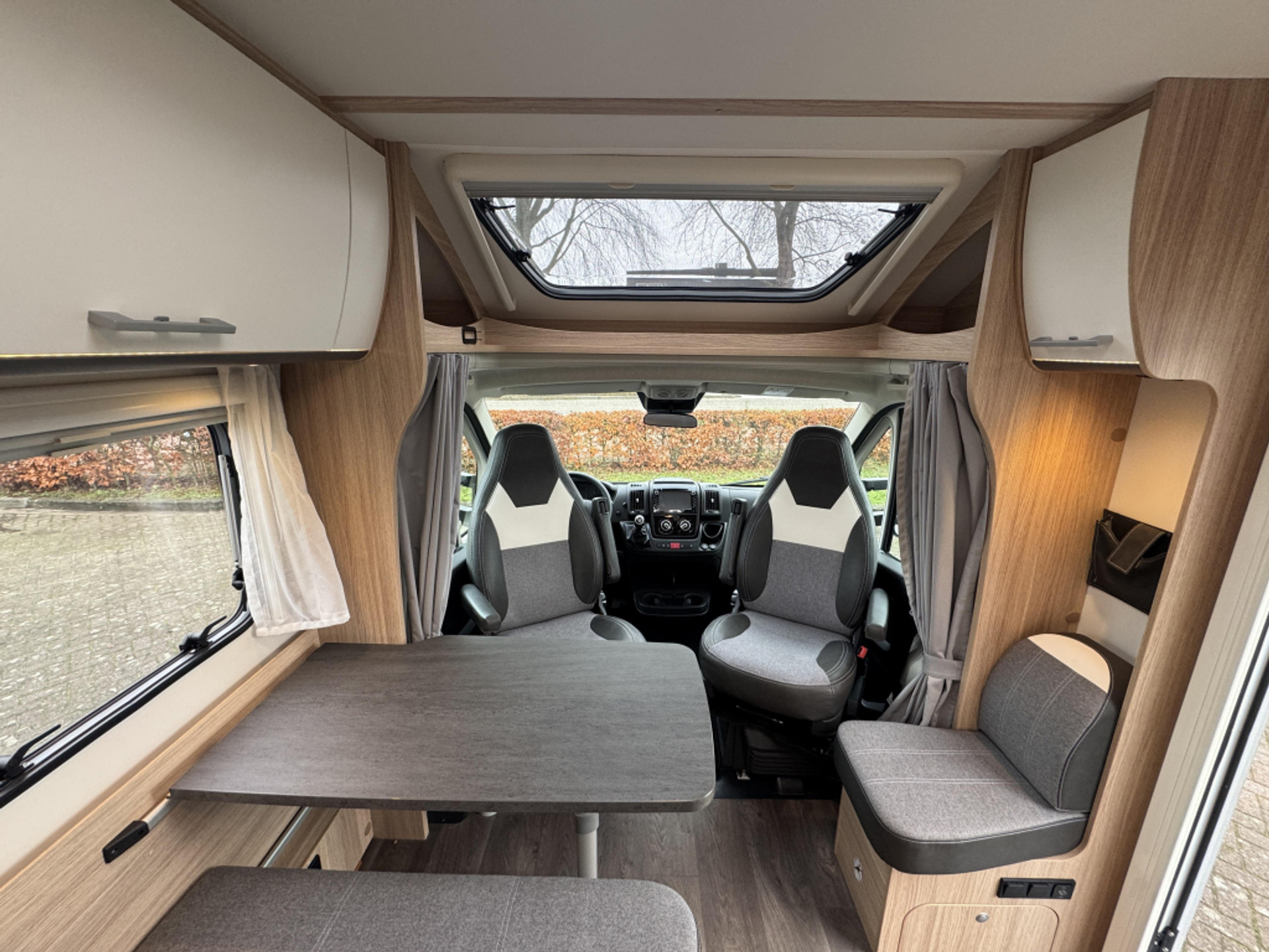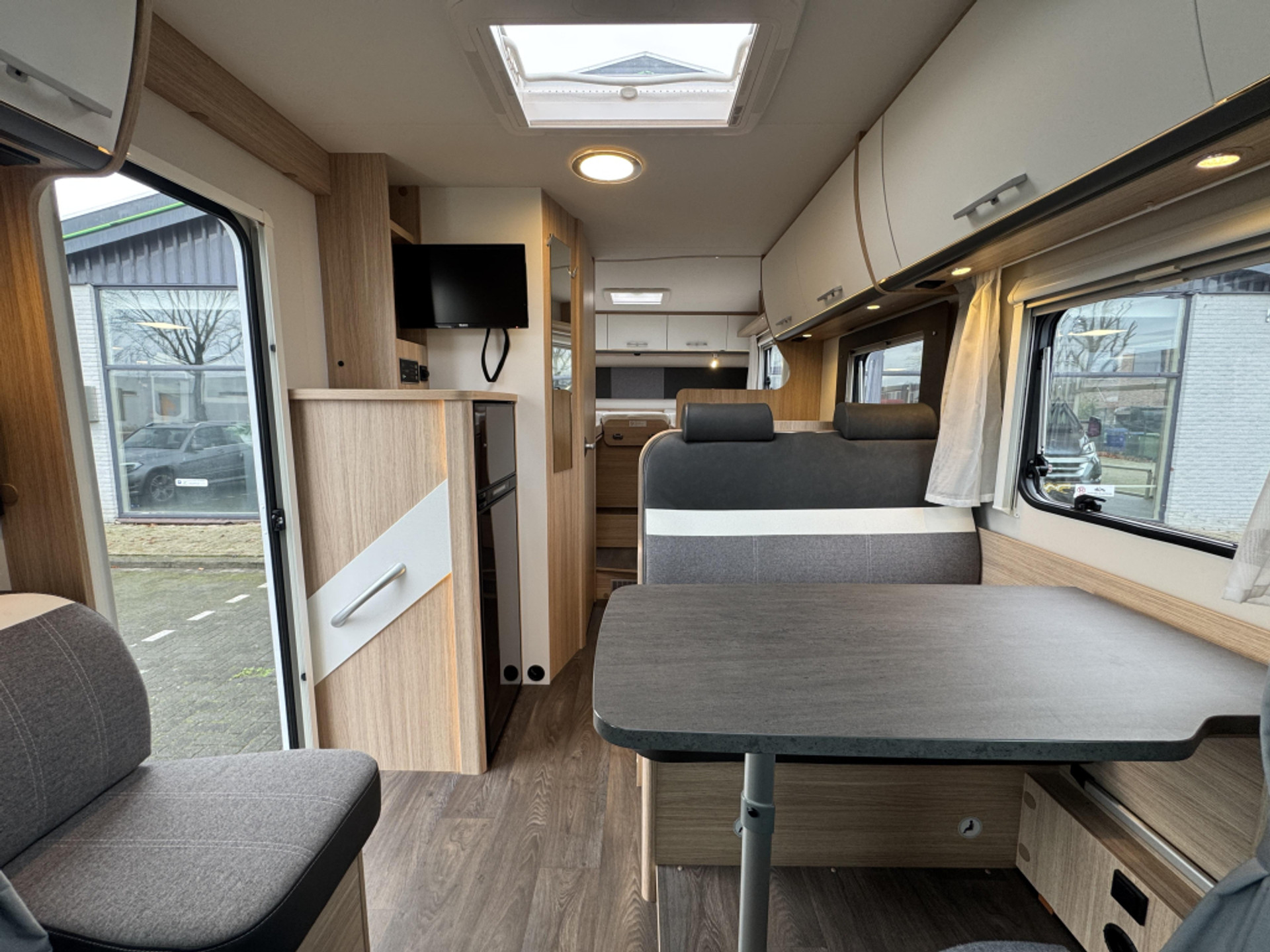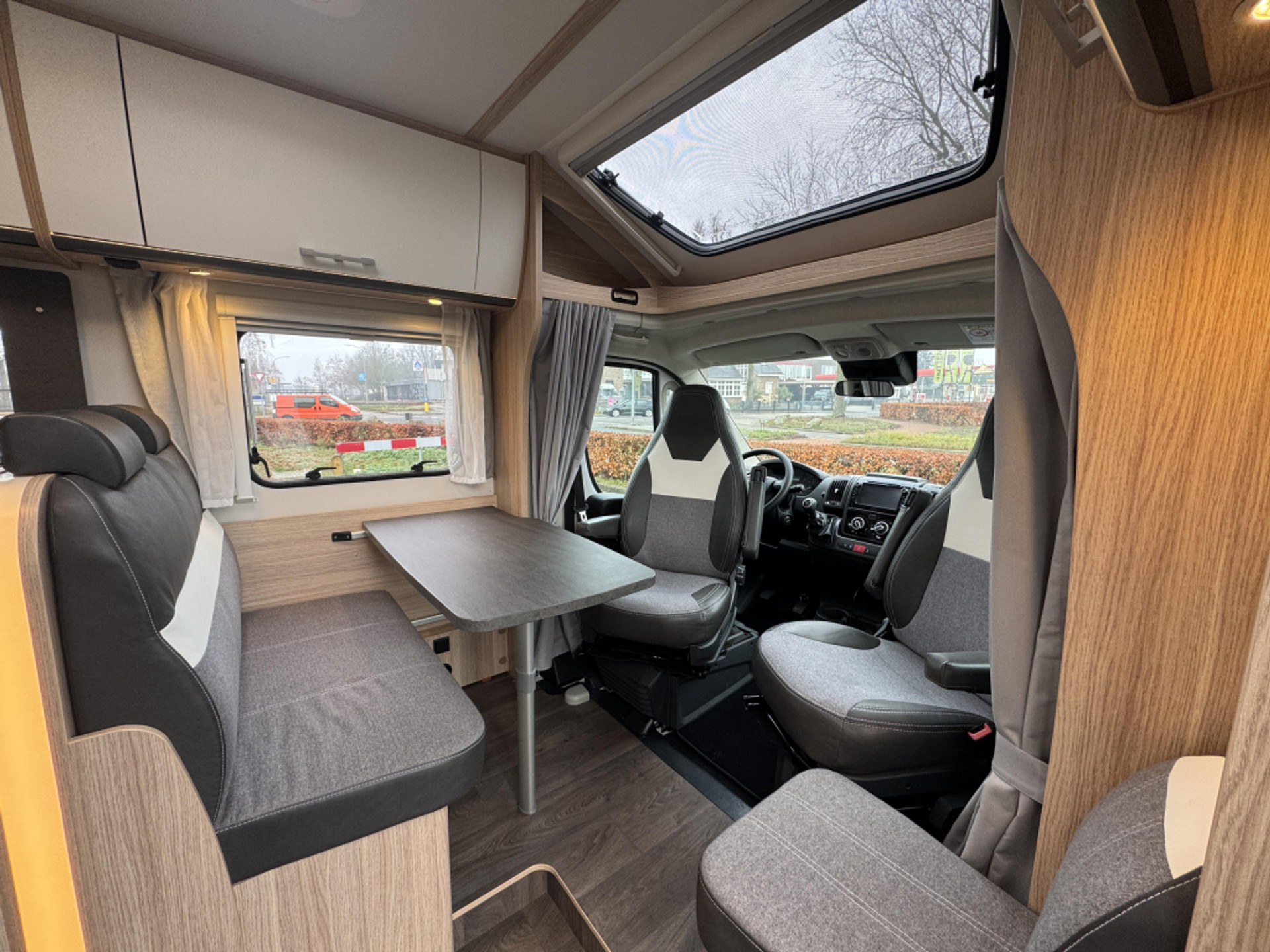 De leefruimte bestaat uit een gezellige zitgroep en een praktische keuken. De camper is functioneel ingericht en geschikt voor zowel korte trips als langere vakanties.