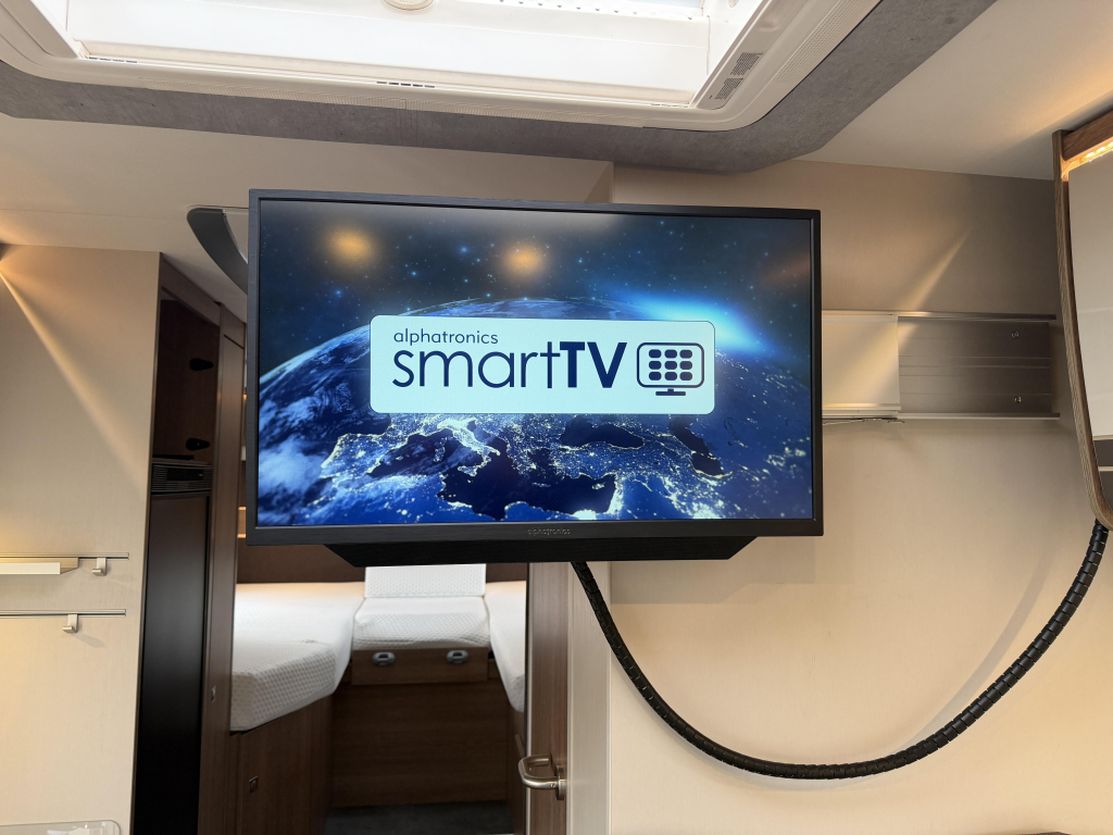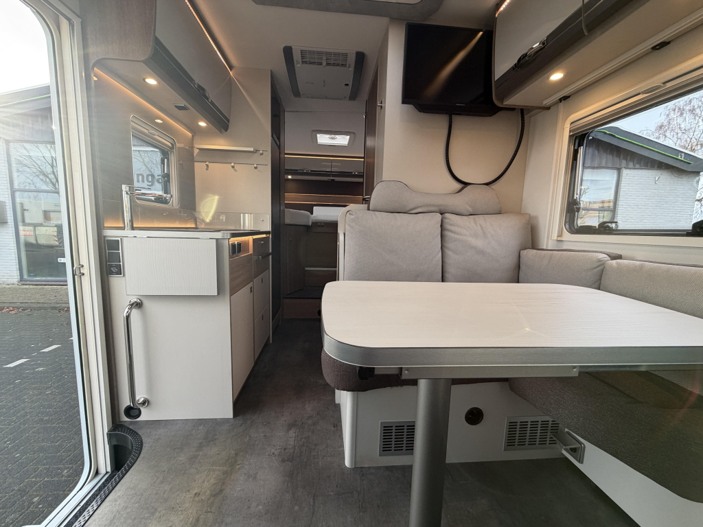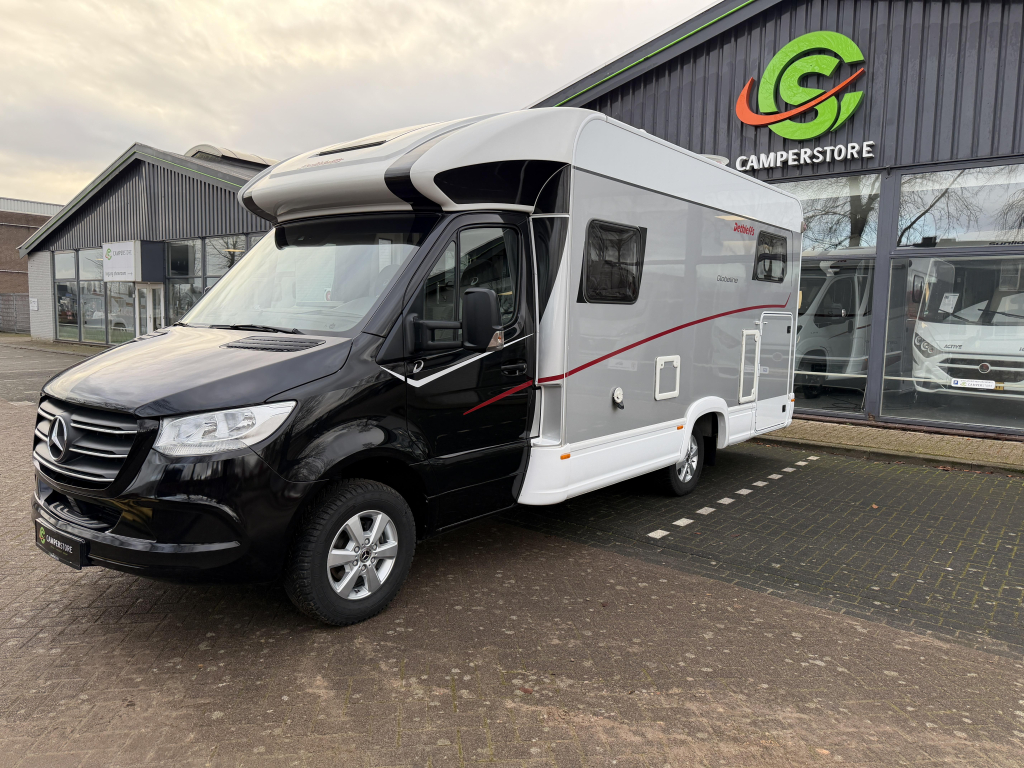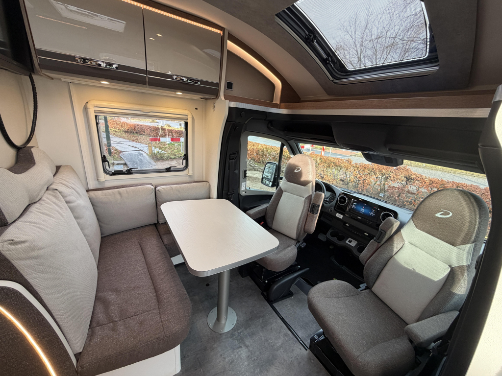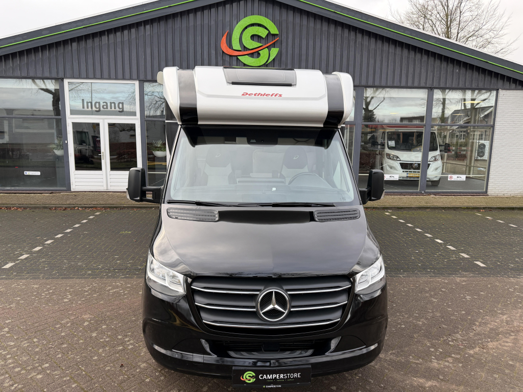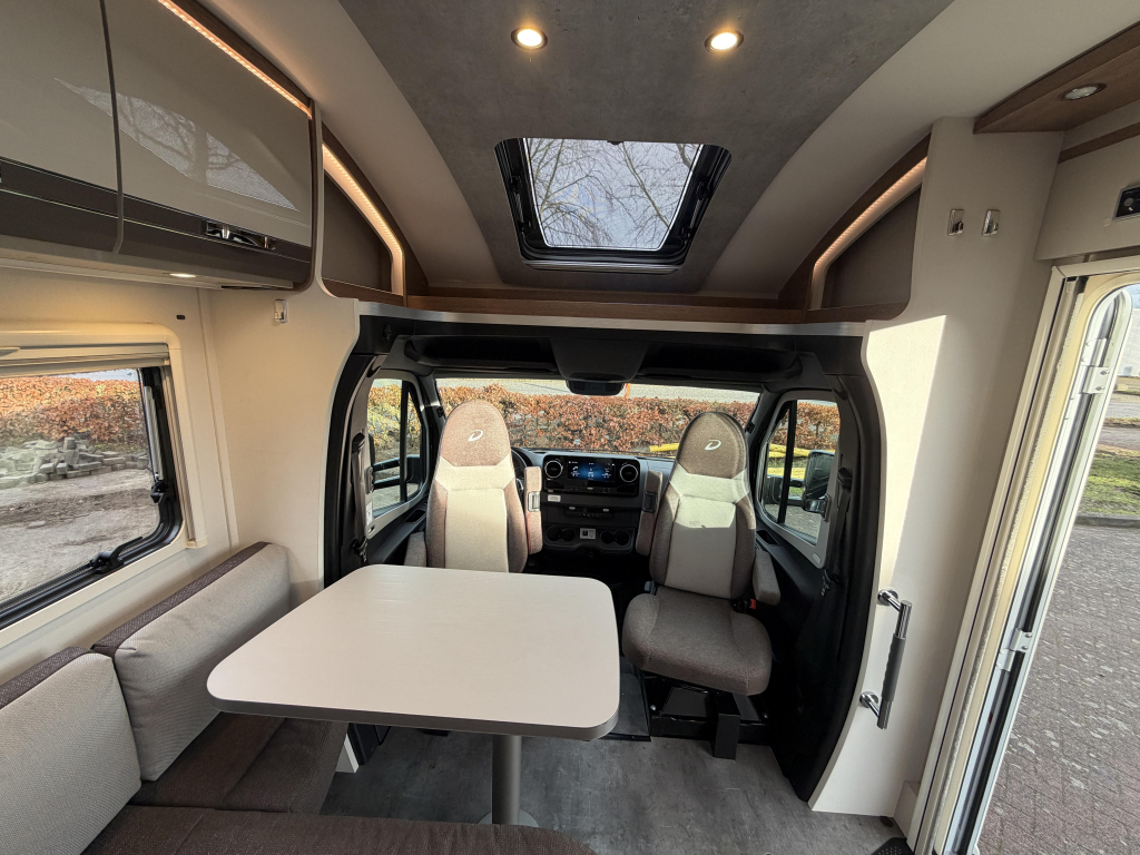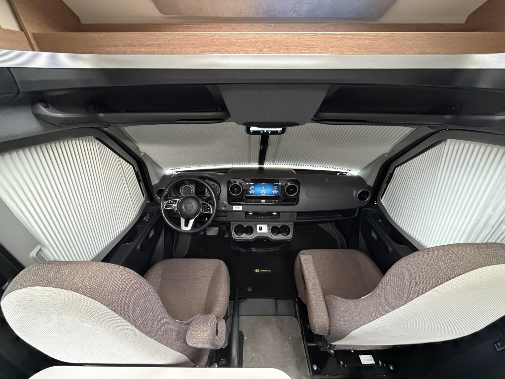 Het dashboard/ cabine beschikt over het luxe Mercedes MBUX 10,25" multimediasysteem incl. bediening op stuurwiel, DAB, touchscreen en achterruitrijcamera. Daarnaast heeft de Dethleffs ook halfautomatische airco, bestuurders- en passagiersairbag, elektrisch bedienbare spiegels en ramen.