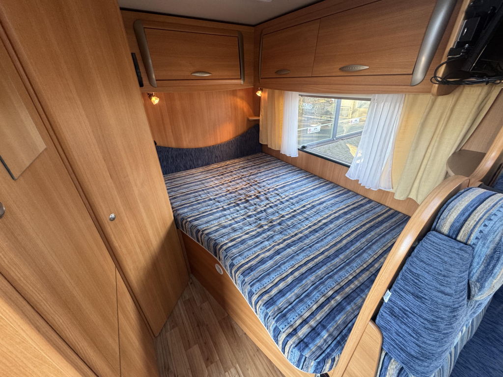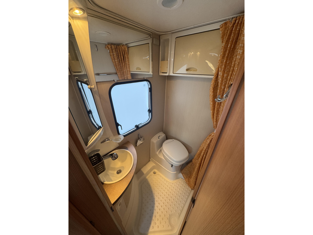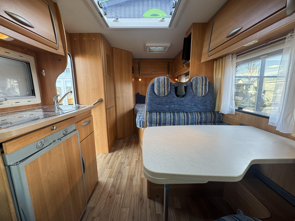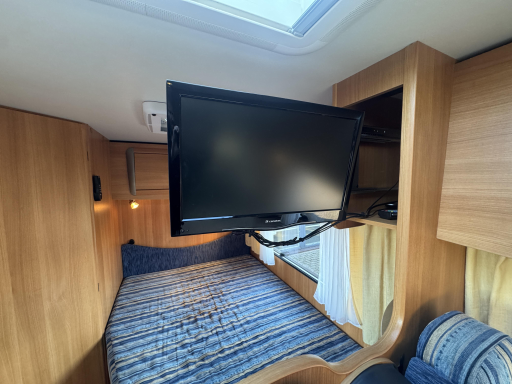 Door zijn indeling binnenin met Frans bed heeft deze camper ondanks zijn compact lengte van nog geen 6 meter veel leefruimte. De Chausson beschikt over een gezellige zit met draaibare pilote stolen.