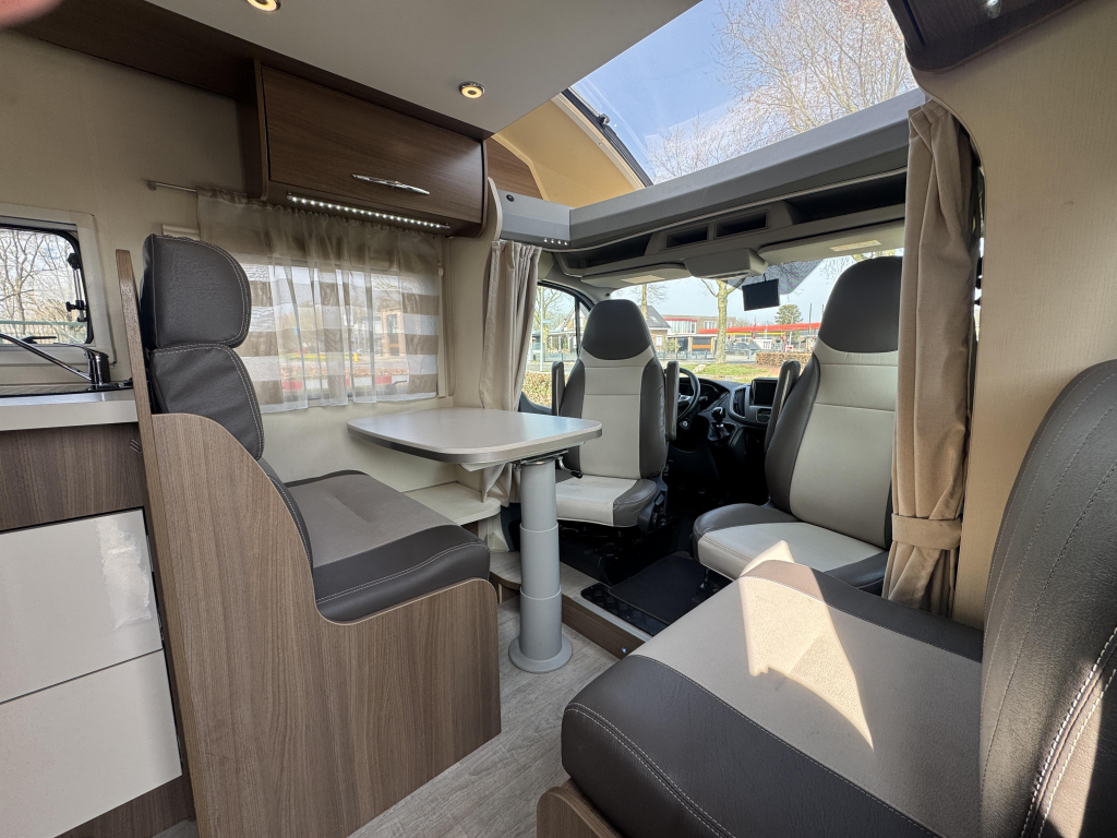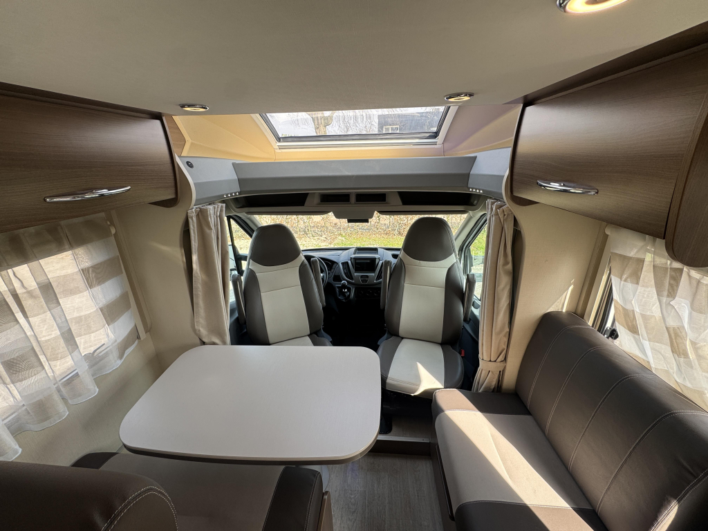 De Challenger heeft een ruime indeling met L zit en geïntegreerde cabine die ruimte biedt voor 5 zitplaatsen! Achterin bevindt zich het queensbed, welke in hoogte verstelbaar zodoende er meer opbergruimte in de garage gecreëerd kan worden.