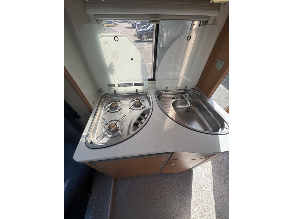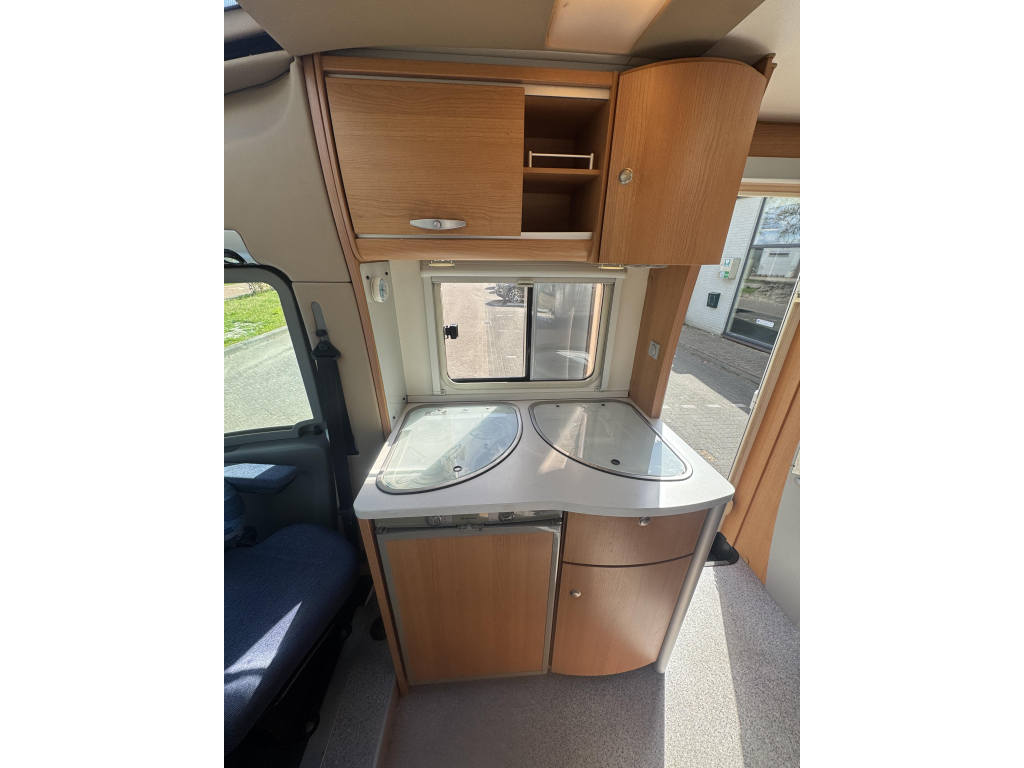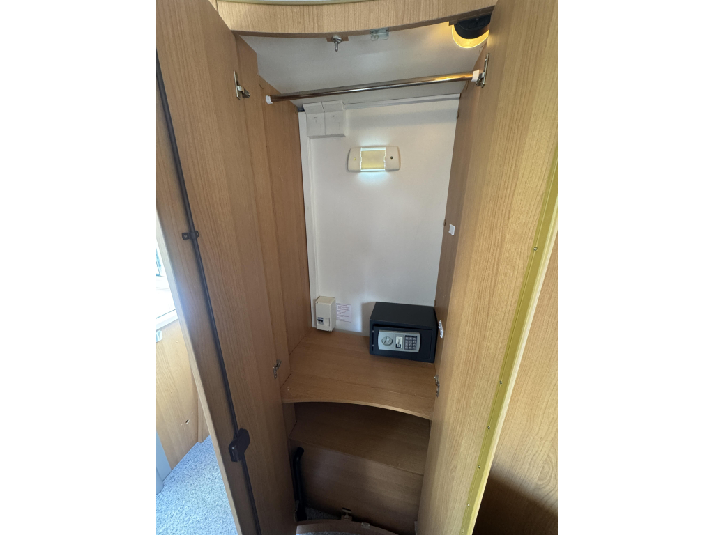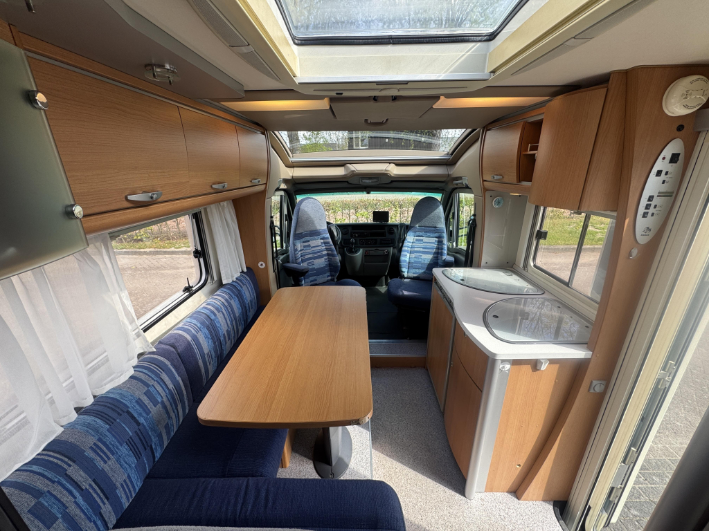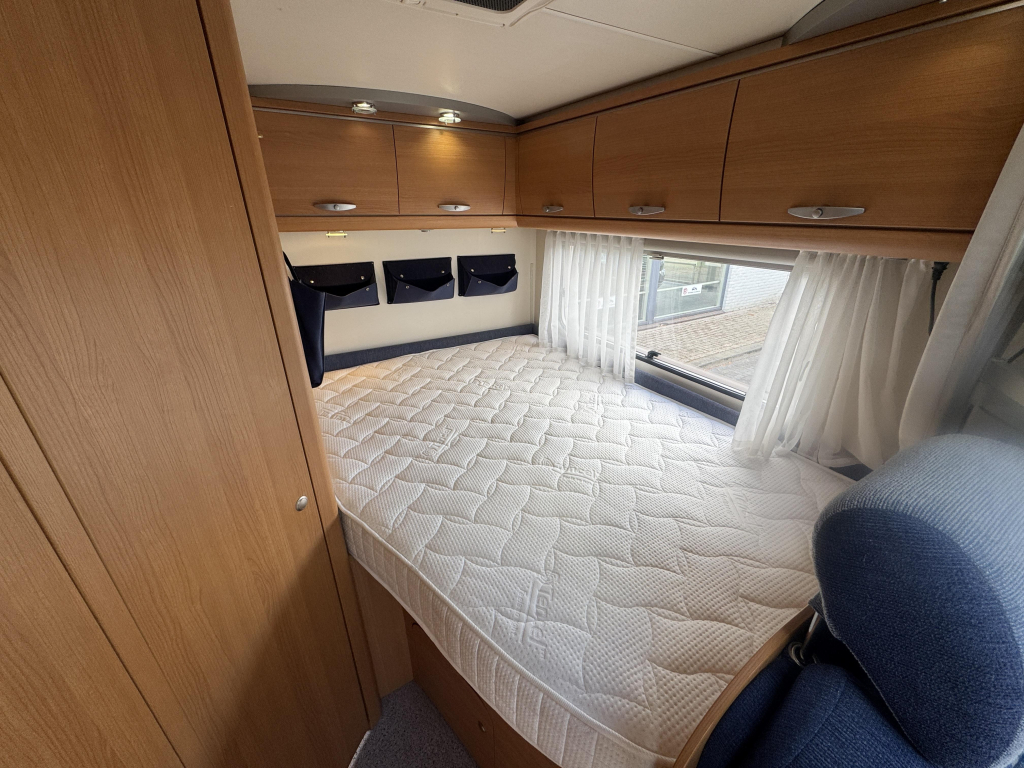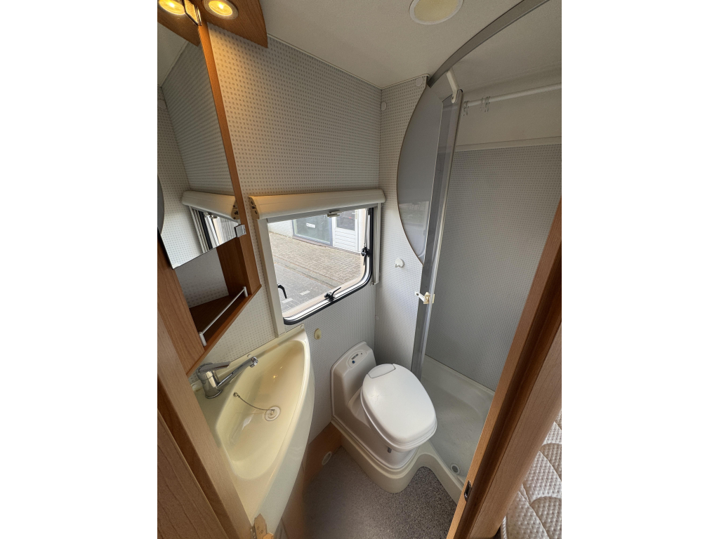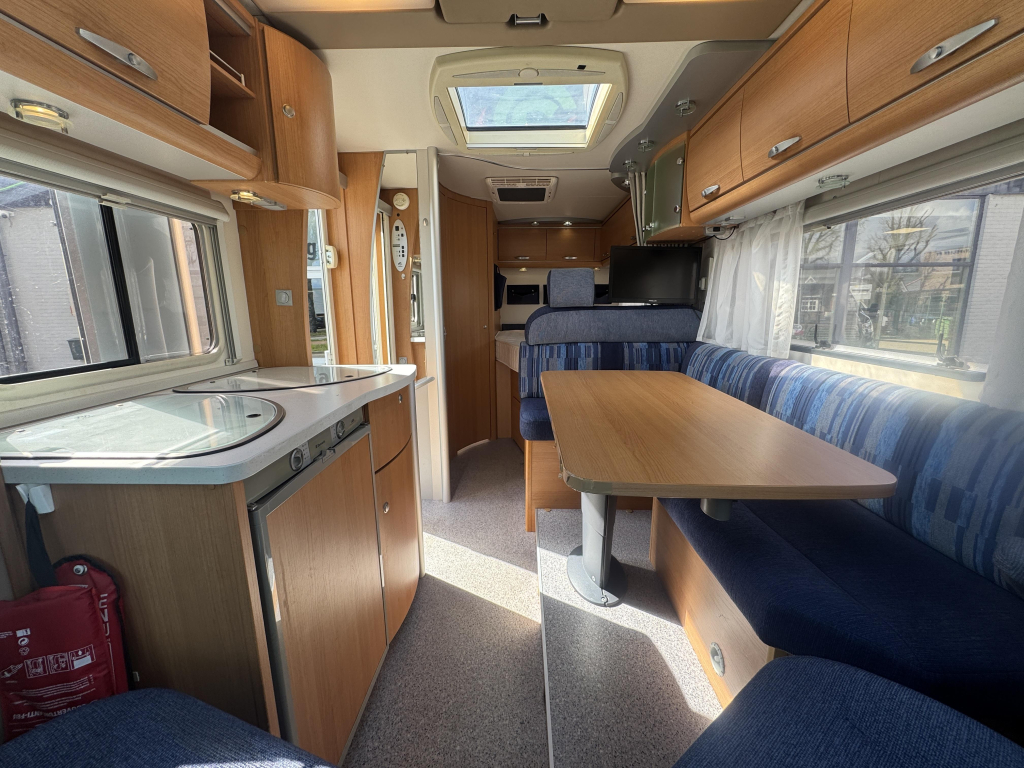 De indeling is praktisch en ruim opgezet, met een comfortabel Frans bed achterin dat zorgt voor een vaste en makkelijk toegankelijke slaapplek. De leefruimte voelt open en licht aan, waardoor je ook bij minder weer heerlijk binnen kunt verblijven. Dankzij de cabineverduistering creëer je bovendien eenvoudig extra privacy en een goede nachtrust.